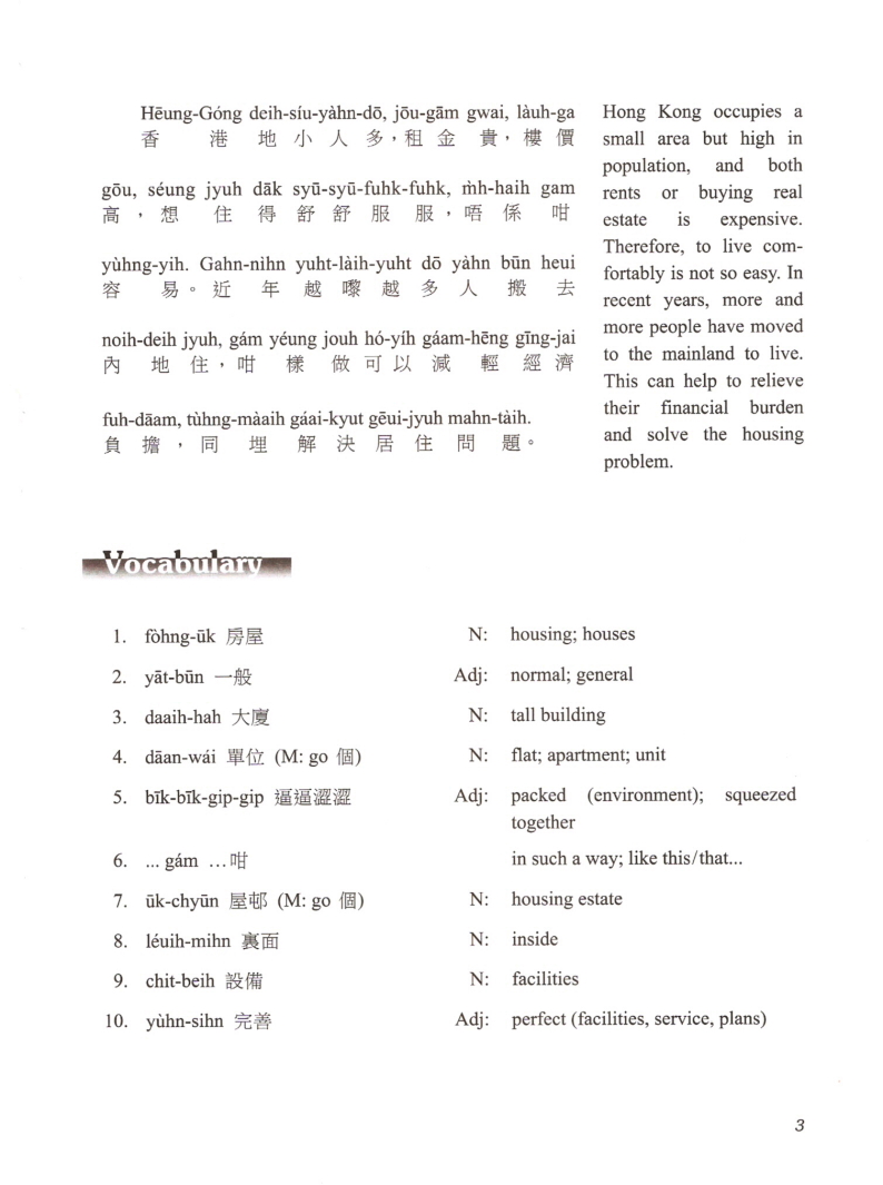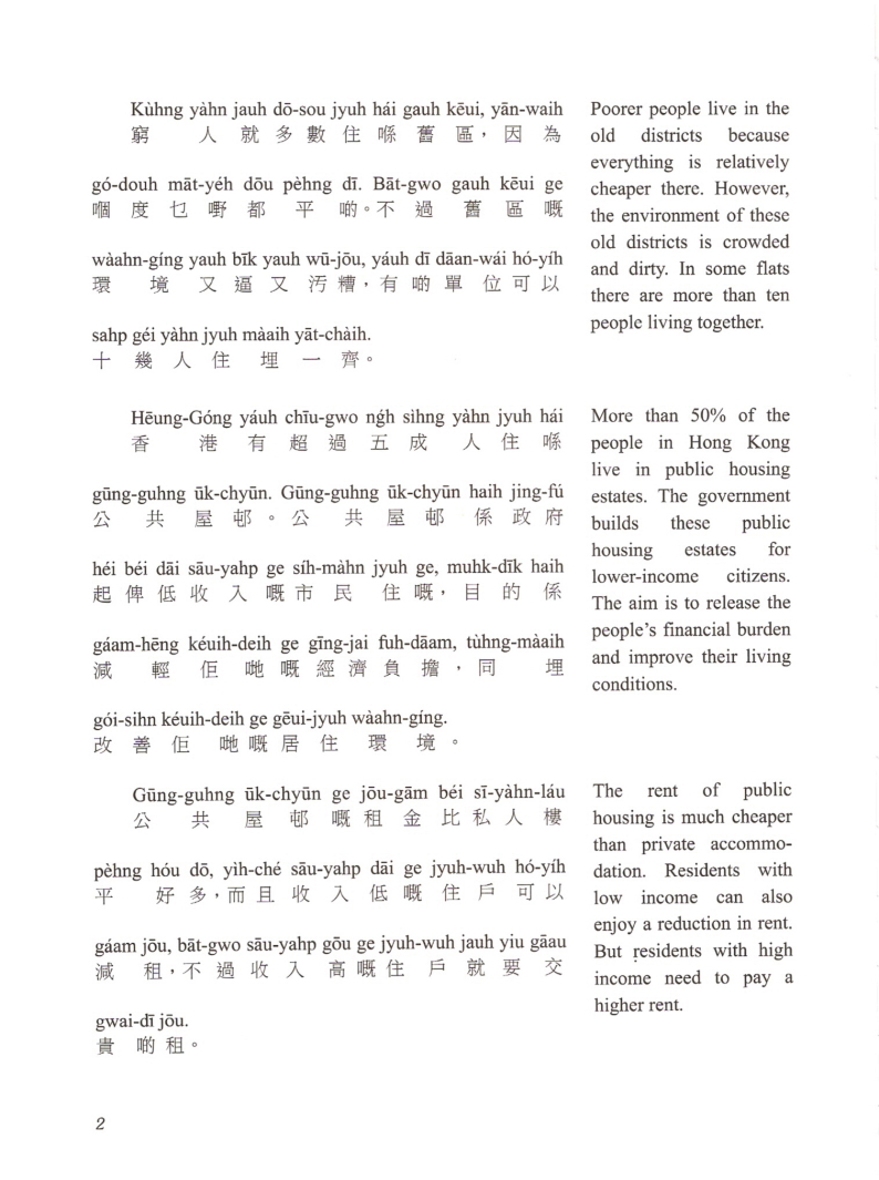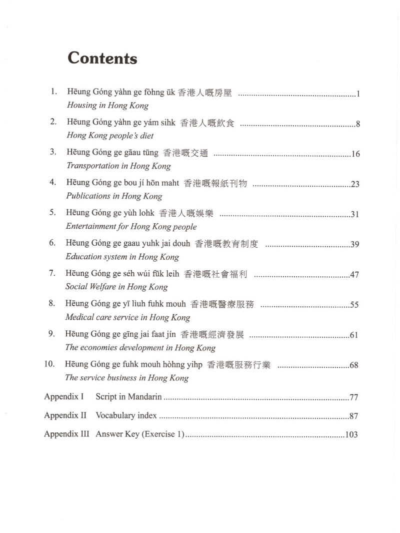 This is a book for people who are interested in the society of Hong Kong. It is also ideal for intermediate Cantonese learners to increase their vocabulary and learn how to present a topic. The topics covered in this book include housing, food, transportation and leisure/entertainment, which are essential aspects of daily life. In addiction, topics on education, social welfare, medical care and the economy give you a better idea about the structure of the society. All these topics show the uniqueness and sophistication of Hong Kong. |
